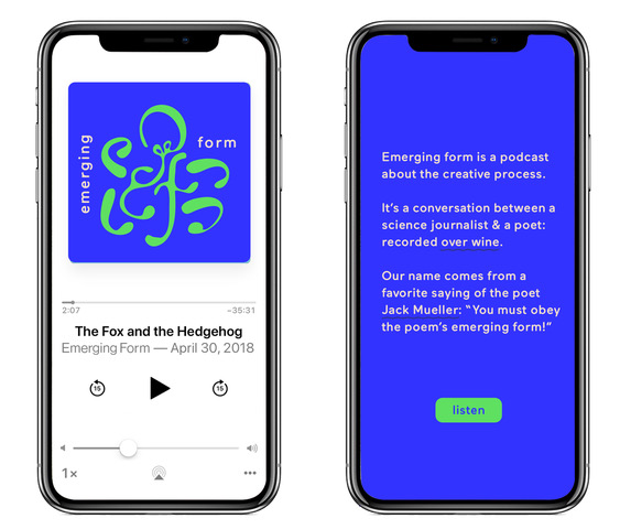 EMERGING FORM is a biweekly podcast about the creative process. Join me and my co-host, the poet Rosemerry Wahtola Trommer, as we discuss creativity, usually over a glass of wine. Guests for season one include poets and writers as well as a sketch artist, a songwriter, a winemaker and a circus performer. Find out more about the podcast on our website, or listen and subscribe via iTunes or our RSS feed. Subscribe to our newsletter to get updates on the show, links to bonus content and helpful tidbits about creativity.